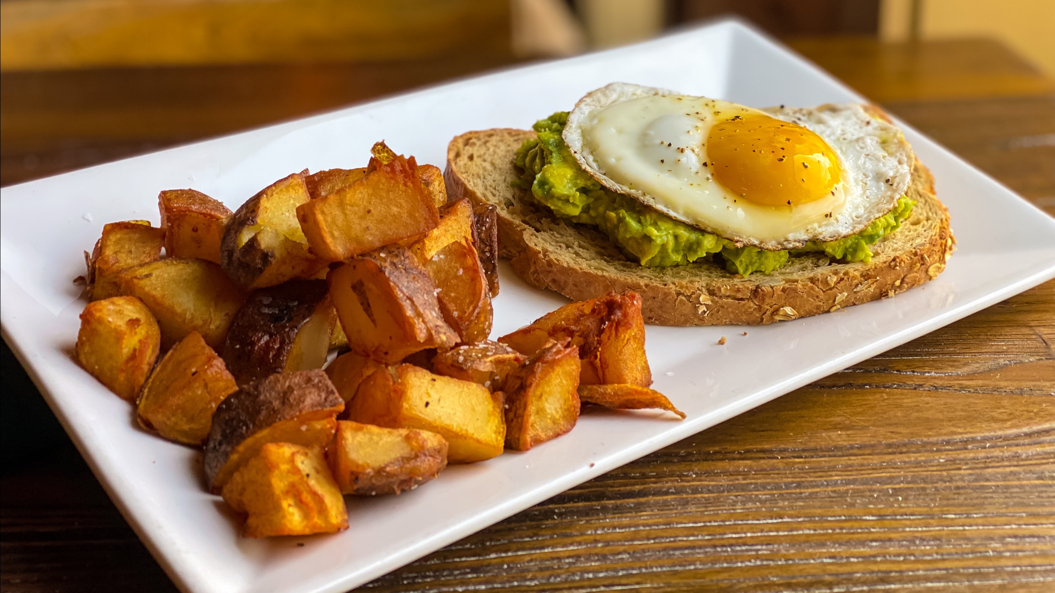 smashed avocado • sunny side egg • garlic confit toast • pines potatoes