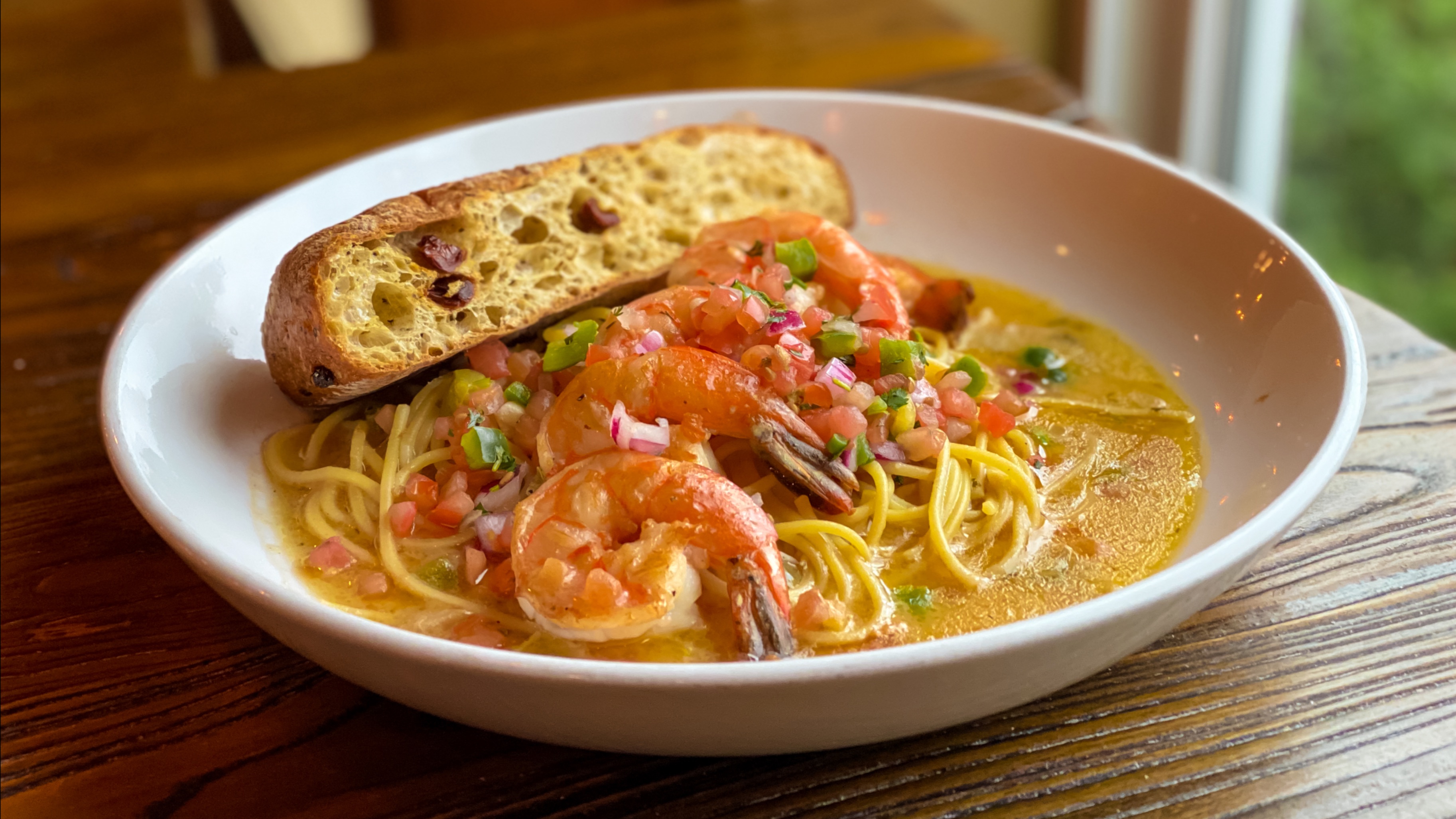 blackened jumbo shrimp • fresh pico de gallo • angel hair pasta • white wine butter garlic sauce • toasted baguette